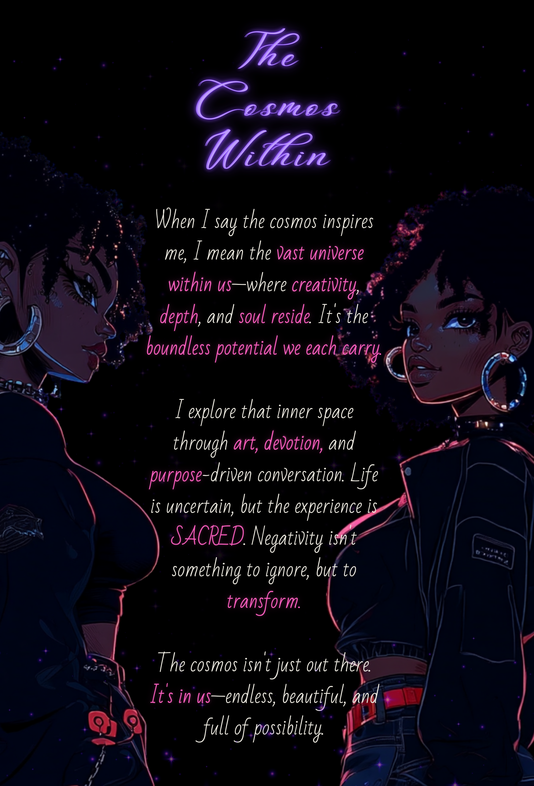 When I say the cosmos inspires me, I’m not just talking about stars—I mean the vast universe within us, where creativity, depth, and the essence of self reside. To me, it’s a metaphor for the soul and the boundless potential we each carry.