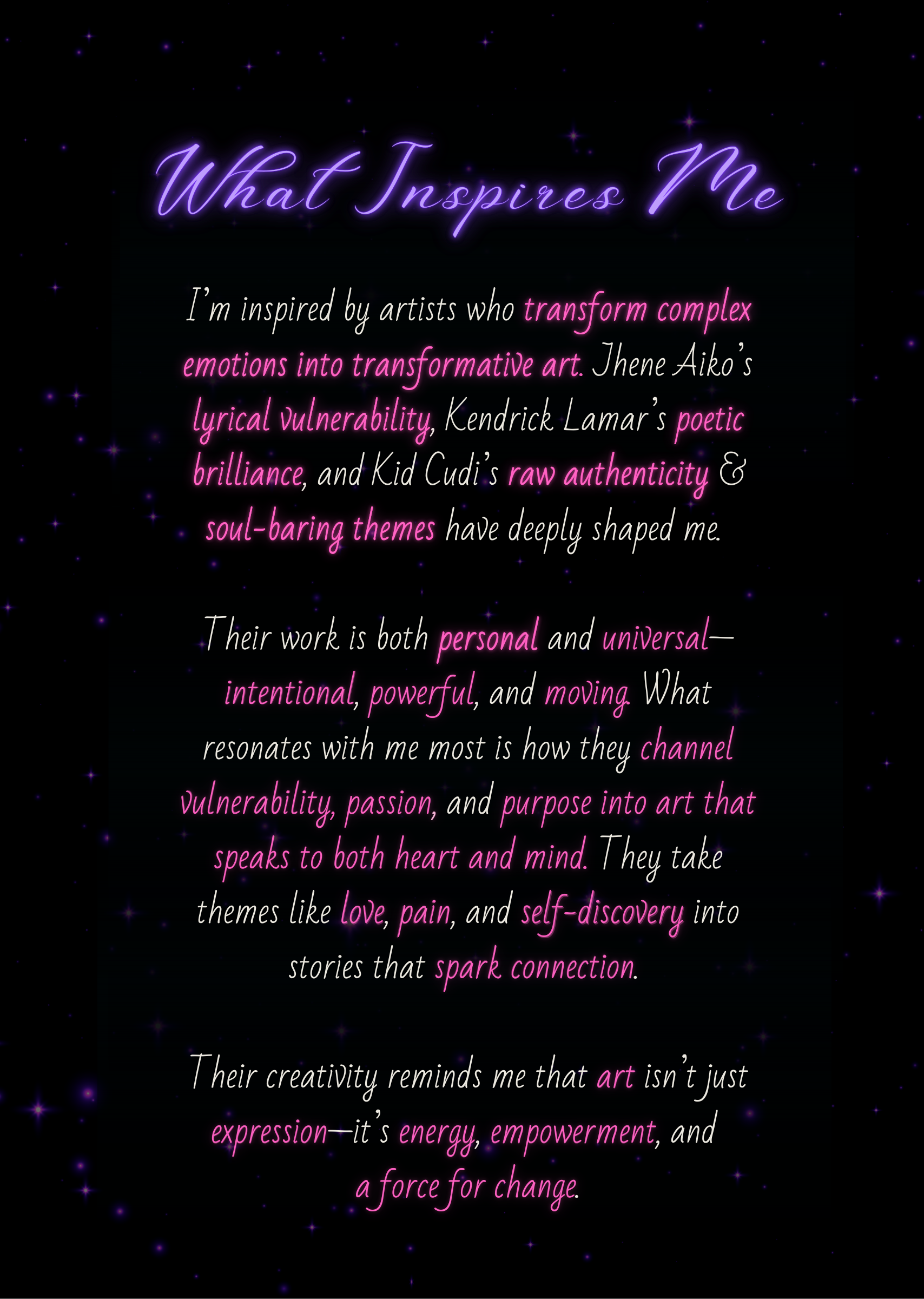 I’m inspired by artists who transform complex emotions into transformative art. Jhene Aiko’s lyrical vulnerability, Kendrick Lamar’s poetic brilliance, and Kid Cudi’s raw authenticity & soul-baring themes have deeply shaped me. Their work is both personal and universal—intentional, powerful, and moving.
