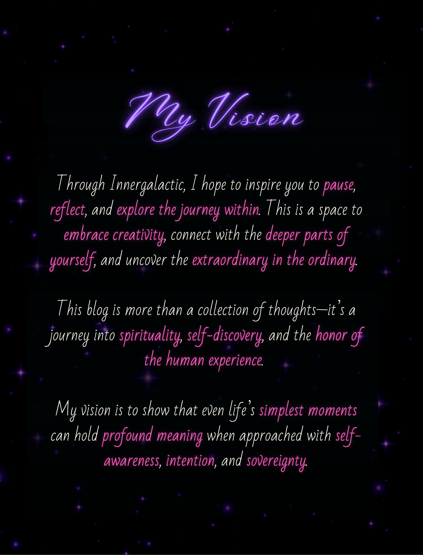 This blog is more than a collection of thoughts—it’s a journey into creativity, self-discovery, and the boundless vastness of the human experience. My vision is to show that even life’s simplest moments can hold profound meaning when approached with self-awareness, intention, and connection.